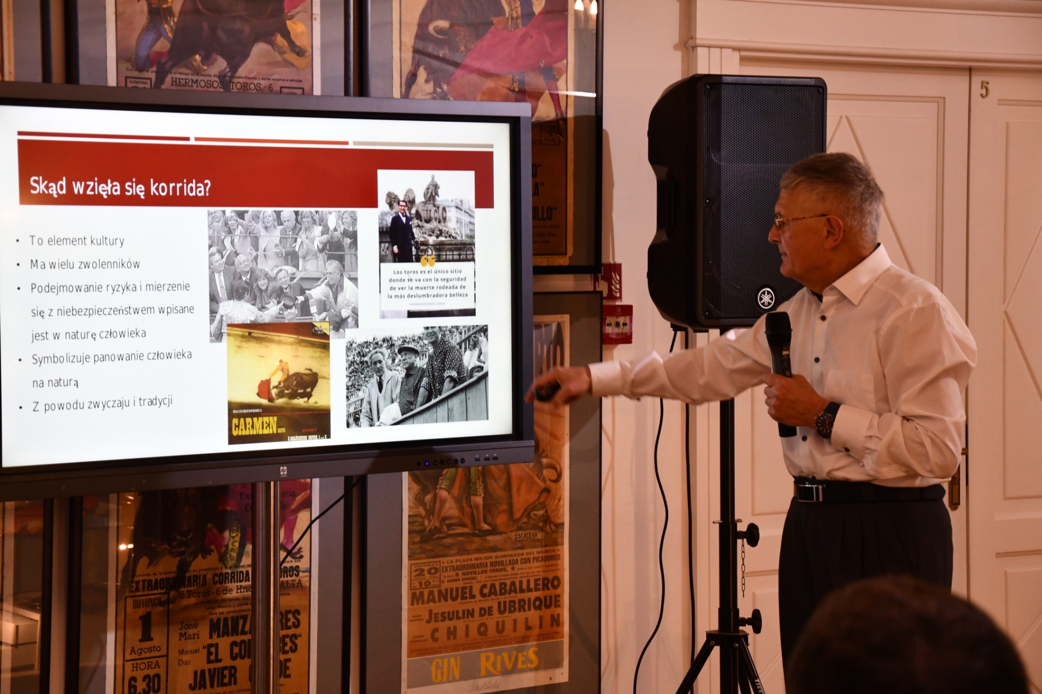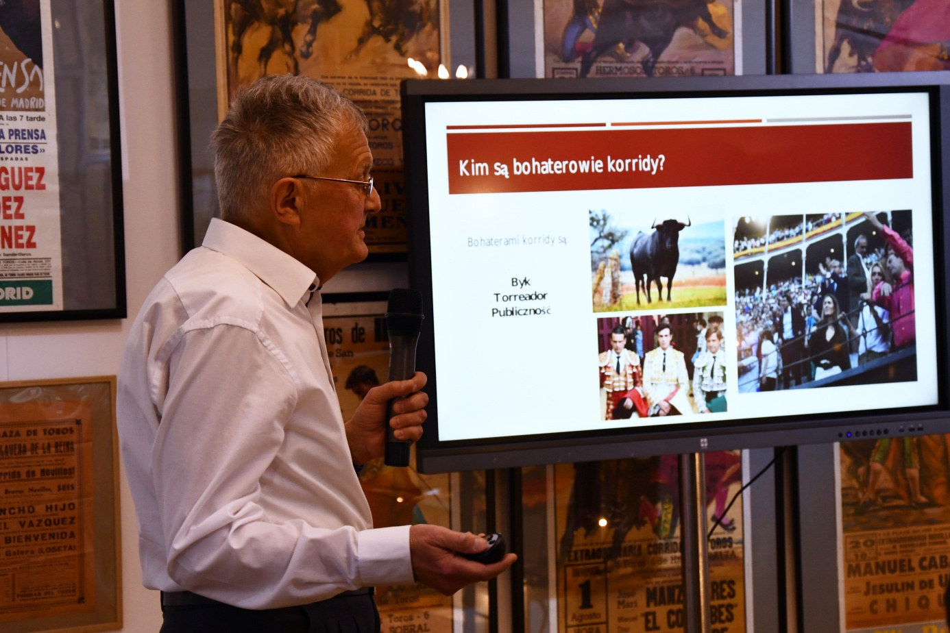 Ryszard Pacak podszedł do tematu prezentacji tajników korridy w sposób wysoce metodyczny, a jednocześnie przystępny, sprawnie łącząc rzeczowe omówienie poszczególnych zagadnień z ilustrującymi je anegdotami. Swoje wystąpienie oparł nie tylko na własnych przeżyciach, ale również na wiedzy naukowej. Tym samym zapoznaliśmy się m.in. z historią walk z bykami (ślady takich zmagań znaleziono np. na Krecie w antycznym pałacu w Knossos, znanym chociażby z mitu o Minotaurze). Dowiedzieliśmy się także gdzie korrida jest organizowana (nie jest to bynajmniej tylko Hiszpania), jakie wyróżniamy jej warianty i style (a jest ich znacznie więcej, niż najczęściej portretowana w filmie i mediach korrida klasyczna), jakie są role poszczególnych osób biorących udział w tauromachii, czego oczekuje publiczność i jak wygląd kontekst kulturowy. Zebrani mogli poznać sylwetki najważniejszych torreadorów, którzy wpłynęli na dzisiejszy kształt tauromachii, ale także spojrzeć na to niezwykłe zjawisko oczyma postaci tak, wydawałoby się, odległych, jak Federico García Lorca czy Ernest Hemingway, dla których stanowiła ona temat ważkich przemyśleń i źródło inspiracji.