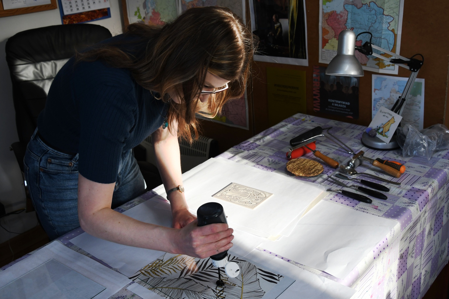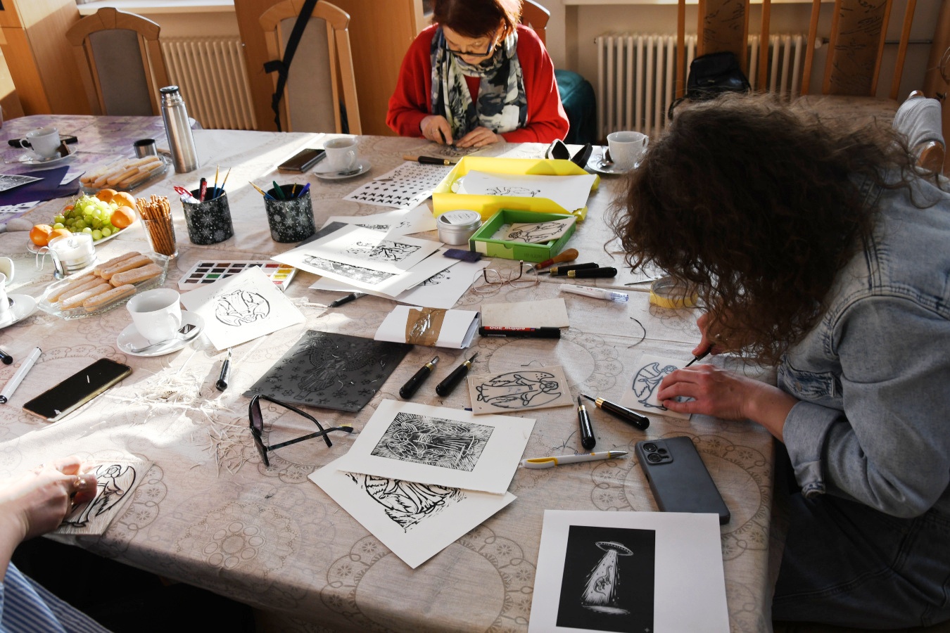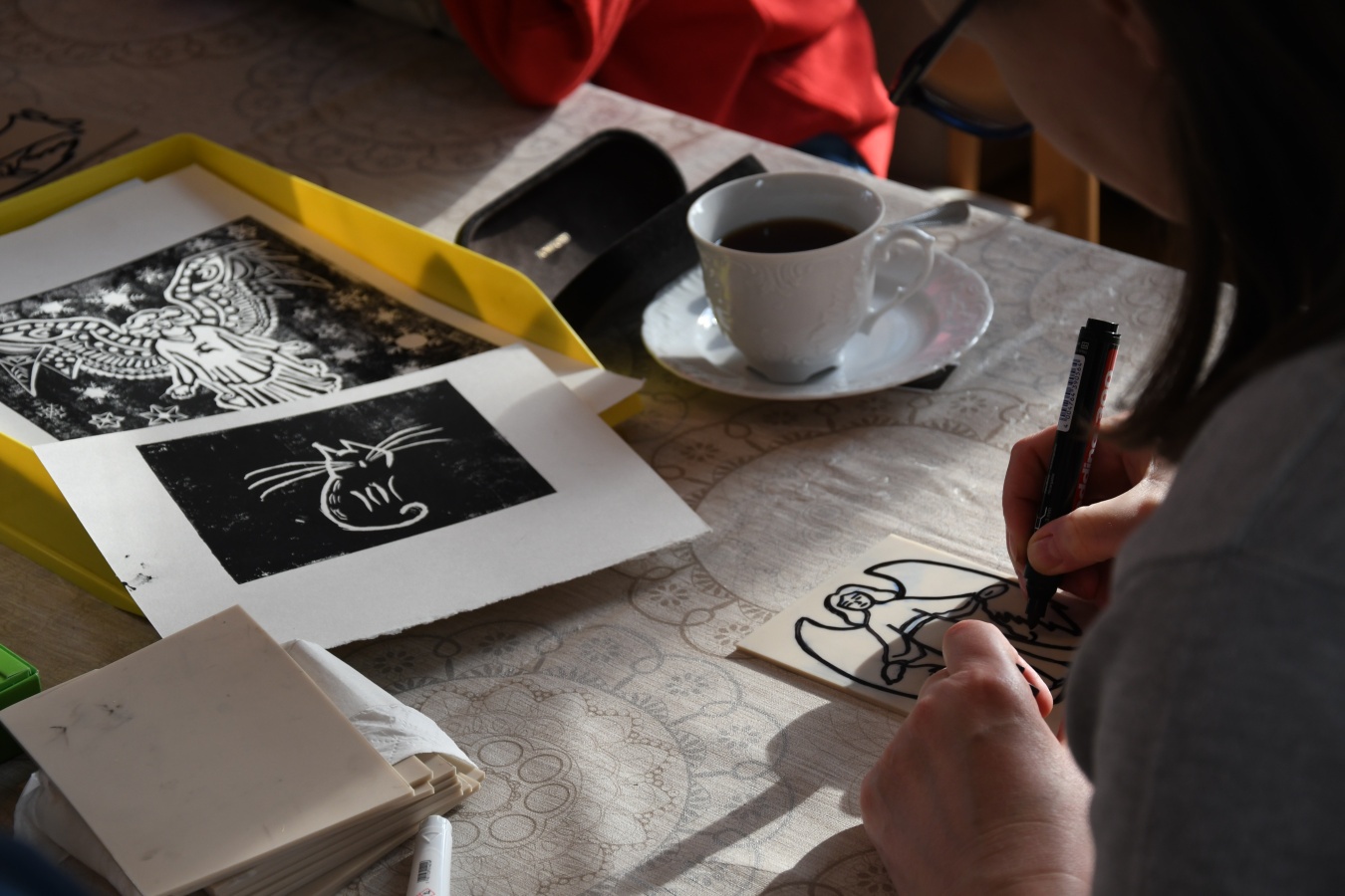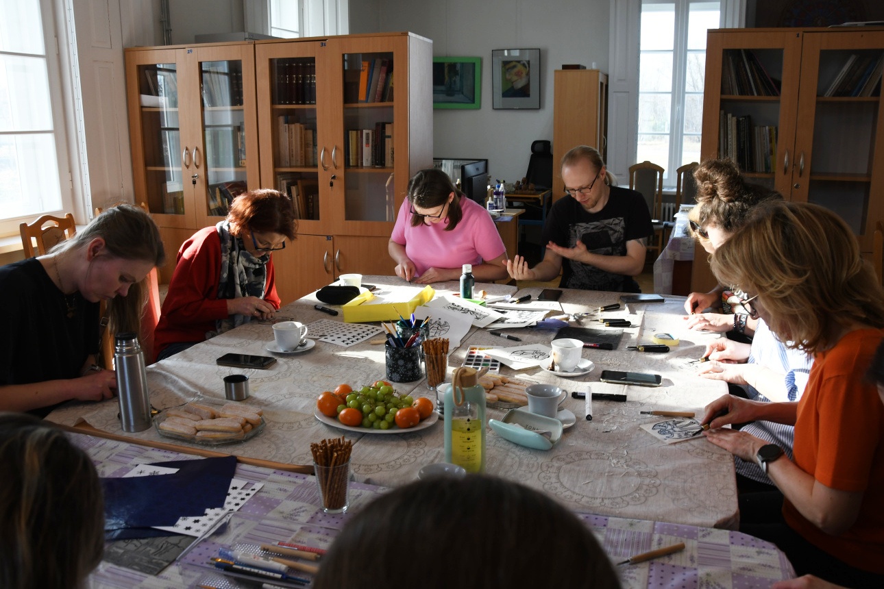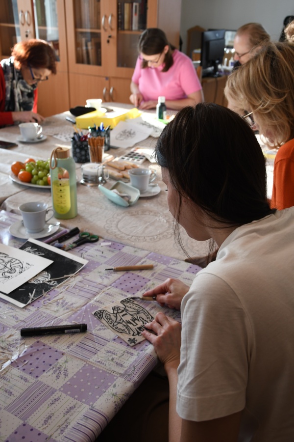 W niedzielę, 1 marca, po raz kolejny przeprowadziliśmy warsztaty z tworzenia linorytu. W przeciwieństwie do poprzednich, które odbywały się w ramach „Ferii dla dorosłych" i miały charakter otwarty, wczorajsze spotkanie przeznaczone było dla pracowników zaprzyjaźnionych instytucji, przede wszystkim filii Biblioteki Publicznej Gminy Kozienice.