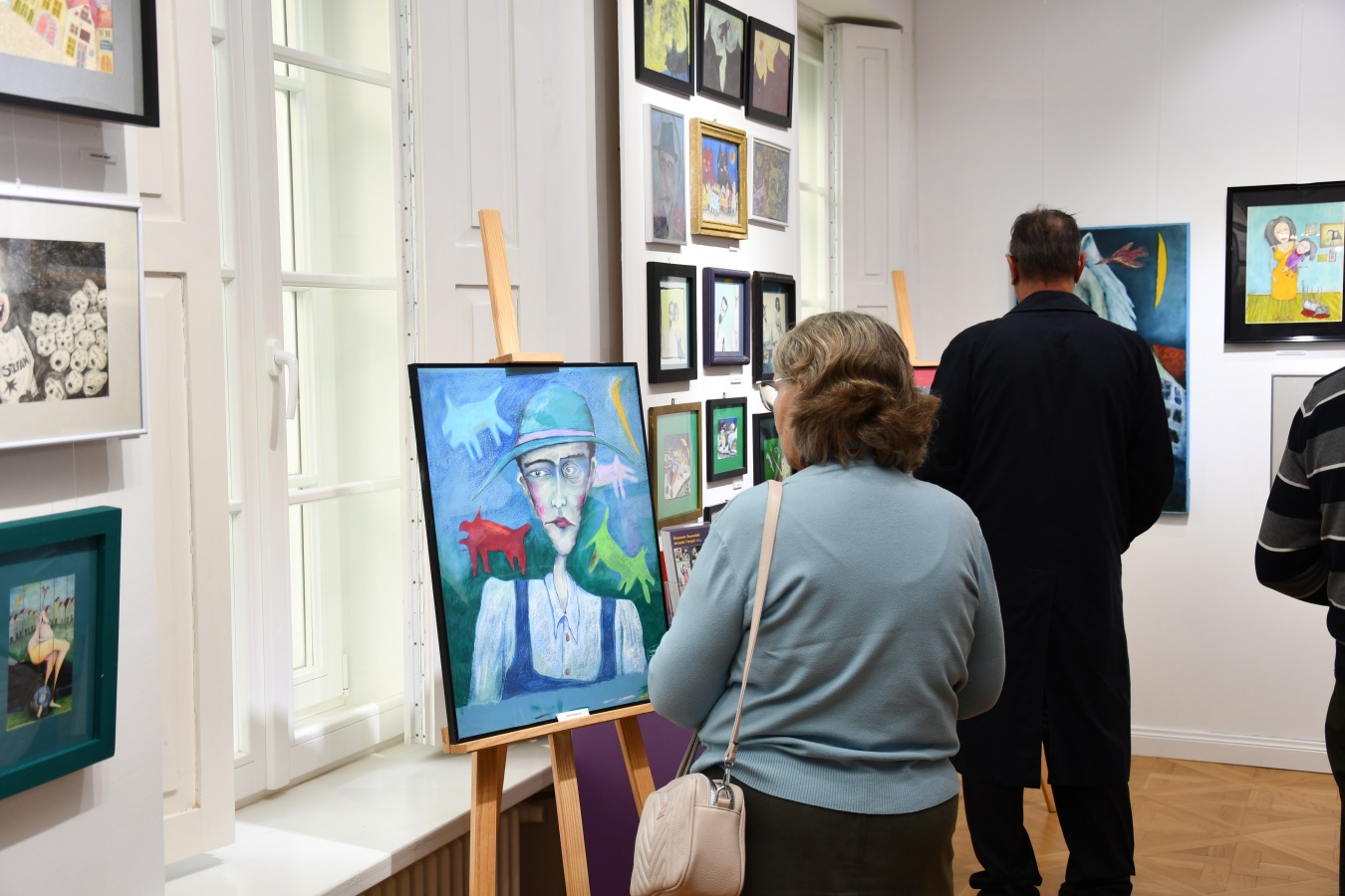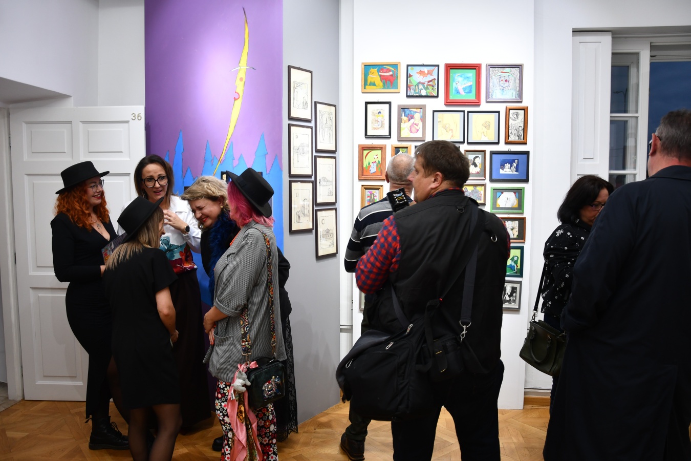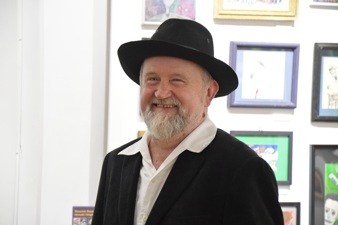 Frekwencja była właściwie maksymalna, więcej osób zwyczajnie nie pomieściłoby się w sali wystawowej. Jednocześnie można było odnieść wrażenie, że niemal każdy z obecnych zna Sławka i jego sztukę od dawna, dzieli z nim wspomnienia i odnajduje w jego (dość ekstrawaganckiej przecież i surrealistycznej) kreacji motywy sobie bardzo bliskie. Czasem zresztą w sensie dosłownym, bo przynajmniej kilka osób mogło z radością wskazać na obrazach samych siebie. Sławek nie stroni bowiem od wprowadzania do malowanych czy rysowanych scen postaci i sytuacji wziętych ze swojego życia i otoczenia. Otoczenie z kolei odwdzięcza mu się podziwem i przywiązaniem, które widać było w niekłamanej serdeczności gratulacji, w pomysłowości podarunków, a anwet w artystycznej swobodzie strojów, w jakich pojawili się co niektórzy goście wernisażu, zmieniając go w swoiste święto sztuki, piękna i wyobraźni. A pośrodku tego wszystkiego Sławomir Zawadzki — postać drobna i skromnie uśmiechnięta, jakby wcale nie była przyczyną i epicentrum całej tej celebracji.