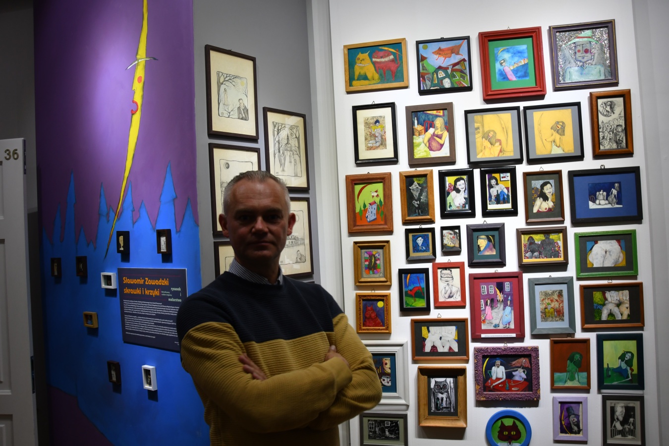 W piątek, 17 października, w naszym muzeum odbył się wernisaż wystawy niecodziennej pod wieloma względami. Po pierwsze, pod tytułem „Skrawki i krzyki" kryją się obrazy i rysunki niezwykłe same w sobie, będące owocem niepospolitej wyobraźni i zarazem technicznej biegłości, enigmatyczne i wciągające w świat „błotnolirycznego realizmu magicznego". Po drugie, autorem ich jest wieloletni pracownik muzeum, Sławomir Zawadzki, którego zmysłowi estetycznemu zawdzięczamy to, jak wygląda większość plakatów i zaproszeń wychodzących z MRK, a także aranżacje wielu naszych wystaw.